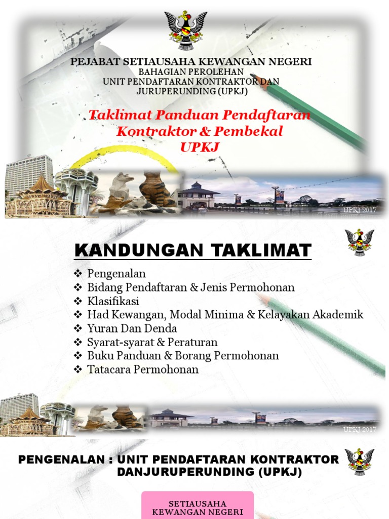 Kontraktor Wakil Kontraktor hendaklah membawa bersama salinan ASAL serta salinan yang telah diakui sah seperti di bawah untuk tujuan pengesahan sebelum dokumen tender boleh dikeluarkan- a Sijil Pendaftaran Perniagaan Sijil Pendaftaran Kontraktor dengan UPKJ dan CIDB b Kad Pengenalan Pemegang Lesen atau Kad Pengenalan wakil syarikat. KEPERLUAN DAN PROSEDUR PENDAFTARAN KONTRAKTOR DENGAN LEMBAGA PEMBANGUNAN INDUSTRI PEMBINAAN MALAYSIA CIDB Bahagian Kontraktor dan Levi Lembaga Pembangunan Industri Pembinaan Malaysia CIDB SENARAI KANDUNGAN MUKA SURAT 1 PERKARA A - PENGENALAN B - TAKRIF C PANDUAN PERMOHONAN 10 Siapakah. Unit Pendaftaran Kontraktor Dan Juruperunding UPKJ Tingkat 7 Wisma Satok 93400 Kuching.